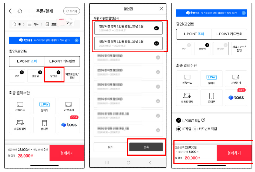 - 할인권 클릭 후 해당 쿠폰 선택 후 등록 > 할인금액 확인 후 최종 결제하기