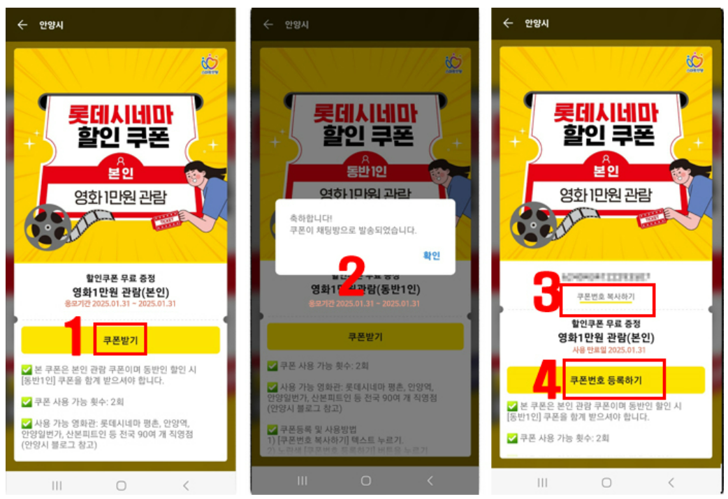 안양시에서 제공하는 카카오톡 채널 친구하고, 롯데시네마 할인 쿠폰 받는 방법에 대해서 알아보겠습니다.
