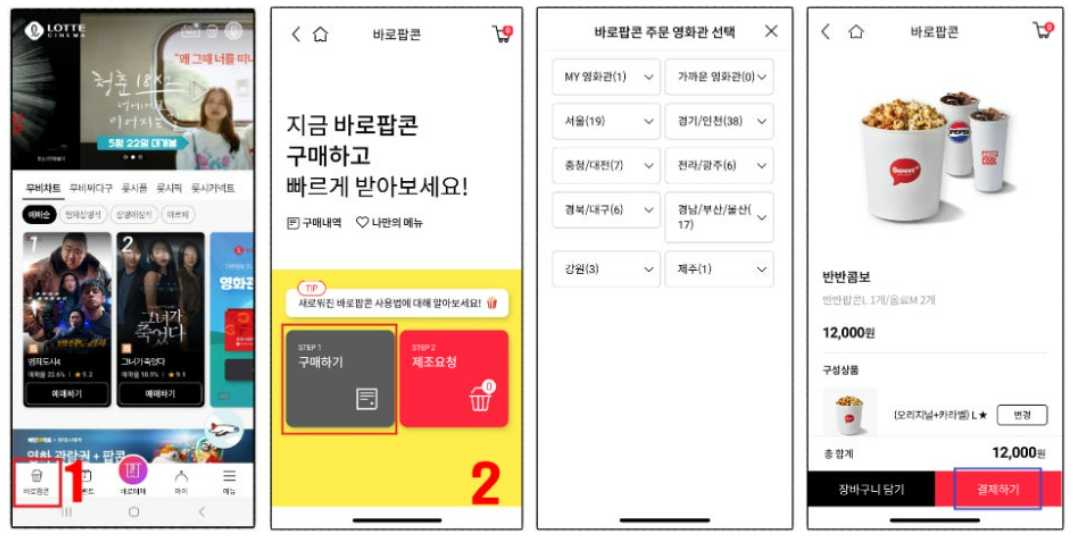- 롯데시네마 앱에서 바로팝콘 클릭 > 쿠매하기 클릭 후 주문 영화관 및 팝콘 선택 후 결제하기